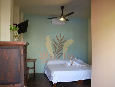 Habitación sencilla con cama king para 2 personas en primer piso con vista la calle principal de Chacala.