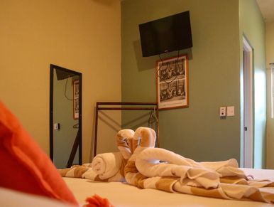 Habitación sencilla con cama king para 2 personas, A/C, Smart TV, en primer con vista a la plazoleta del pueblo.